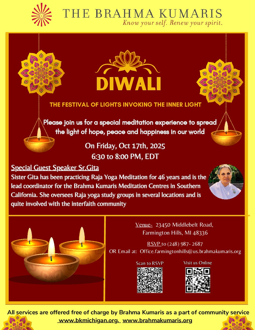 Venue: 23450 Middlebelt Road, Farmington Hills, MI 48336 RSVP: Call: (248) 987-2687 Email: Office.farmingtonhills@us.brahmakumaris.org Or RSVP online here: https://docs.google.com/forms/d/e/1FAIpQLSeqhibzjaXkXoAUfRVAWtBnKrTj2TwfviNmYpMiPoHRxiqOnw/viewform?vc=0 This Program is offered by: The Brahma Kumaris Michigan Note: This program is offered free of charge as a community service.